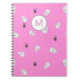 Hand drawn pink plaid pattern with skulls and spiders, perfect for a coquette feminine Halloween spirale notebook personalised with your own initial.