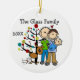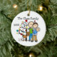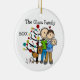 A cute, fun ceramic ornament featuring a stick figure couple, baby boy in a blue blanket, a large brown dog, small white dog, holiday tree, and te can add your names or surname and the add the current year!