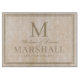 Elegant cream and tan damask pattern cutting board with the couples first names, last name monogram, full last name, and wedding date available in customisable templates.