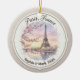 Capture the timeless romance of the French capital with this personalized watercolor ornament. The design features a delicate, painterly illustration of the Eiffel Tower framed by blooming cherry blossoms and a soft sunset glow reflecting off the Seine.