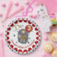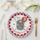 Cowgirl 3rd Birthday paper plates features a little cowgirl dressed in a cow print vest and cowboy hat and boots, a hobby horse, stars, red balloon, text that reads I'm 3, red and blue stars border, and an area you can customise with a name and age, thank you message, or anything you want it to read!