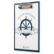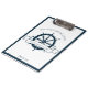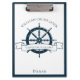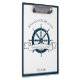 Chic custom summer vacation clipboard for your beach cruise line on the ocean featuring a navy blue boat steering wheel. This nautical themed design is perfect for a sailor taking notes on the sea or to commemorate a special trip to the seaside. Personalise with your last name and year.