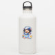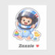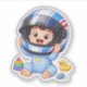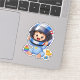 Adorable cartoon baby astronaut sitting happily in a blue, wearing an oversized space helmet with bright stripes. Surrounded by colorful baby toys, this cute illustration blends childhood innocence with a playful space theme, perfect for kids designs, nursery art, stickers, and creative projects.