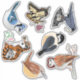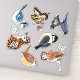 A selection of graphic birds and animals, reproduced from my own original illustrations. A raven on a skull with a key, a baby tiger and butterfly, a blue jay, a carolina wren, a black capped chickadee, a heart barn owl, and an eastern swallowtail butterfly and pink flowers.
