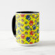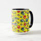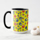 A white Ringer Mug with a black lip and handle and a pattern of cute owls in red, blue, green on a yellow background, which you can easily change by using the edit button. The owl pattern was an original handpainted paper collage design by Judy Adamson.