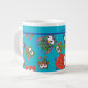 A fun, customisable Jumbo-Sized Coffee Mug, with a pattern of cute owls in red, blue, green on a Turquoise Blue background. The owl pattern is from an original handpainted paper collage design by Judy Adamson.