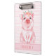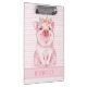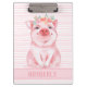 An adorable watercolor pig with a floral crown over a background of pink stripes.