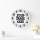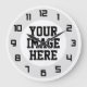 Custom, create your own wall clock. Clock comes predesigned with numbers and semi-translucent circular graphic underneath. Simply add your own photo, graphic or text to create your unique, one-of-a-kind wall clock. Black numbers design - looks best when the image you add is lighter.