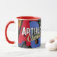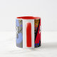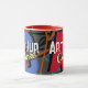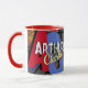 Stylish red-mug personalised with his name in cool font styles, and with big oversized red and blue initial letters with black shadow... modern monogrammed design... comic inspired abstract background.