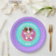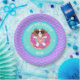 This custom birthday party plate features Sophie, a brown and white cartoon dog, relaxing on a inflatable pool float in the shape of a doughnut. Sophie is wearing sun glasses and is wearing a pink swimsuit with a pineapple design on it. Party plates have a wavy pattern and sparkles as accents. The party plate has tones of aqua, purple, bright pink, white and mint green.