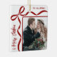This double-sided Christmas ornament lets you feature a different photo on each side or use the same one for a coordinated look. A hand-drawn red bow sits in the top left, with ribbon lines running across the top and down the left edge for a simple decorative touch. “Merry Christmas” appears vertically along the bottom left, with the date just beneath it, and your name in the top right for a balanced layout.