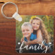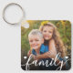 Create a custom keepsake with this personalised family or kids photo keychain, now featuring a sweet new design on the front. The layout includes space for one favourite photo with the word "family" written across the bottom in a flowing script font, accented by a few small heart details. A subtle black gradient sits behind the text to help it stand out without overpowering the image.