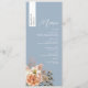Elevate your reception with this personalised wedding menu, featuring elegant dusty blue background, soft peach watercolor florals, and a guest name printed on a vertical strip—perfect for combining a menu with a place card. Ideal for spring, summer, boho, or rustic weddings, this custom menu brings a polished, coordinated touch to your table settings. Matches beautifully with the full Dusty Blue and Peach Floral Wedding Suite.