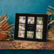 Eight Photo Family Plaque. Customise with text and photos. Black background. Gift. Foliage.