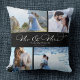 Personalize this modern elegant calligraphy Mr and Mrs script throw pillow with your family name, 4 favorite wedding photos and this will be a beautiful keepsake of the best day ever! Great gift for any newlyweds, your parent's wedding anniversary, or a vow renewal.