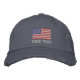 Custom embroidered hats with American flag logo. Add your own text below the US flag. Patriotic USA pride design for men women and kids. Dark cap with personalised embroidery and flag of America. Make your own headwear for friends and family. Cool Birthday or Father's Day gift idea for dad, grandpa, father, brother, uncle, coach, boss, veteran, boat captain, business employee, office co worker, company staff, personnel etc. Also nice for 4th of July / Independence Day party. Available in different colours. Rugged distressed look masculine hat. Great for fishing, boating, sailing, golf, tennis and other sports. Fourth of july presents.