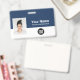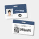 Easily personalise this Custom Employee Name Badge with Photo, Qr Code, Scan Bar Code and business logo, with lanyard included. A simple business design in navy blue and white colours fully customisable in front and back sizes, sans-serif basic and modern fonts and a professional and clear look. Avaiable with or without lanyard, metal clip or with retractable. No minimum order.