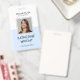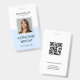 Modern square-shaped personalised employee photo ID name badge with a custom QR code. Simple, sleek light blue Identification name and title photograph badges. Security photo tag.