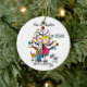 A cute, fun ceramic ornament featuring a stick figure expectant couple, a cat, a dog, holiday tree, and text that reads "We're Expecting!" with an area you can add your names or surname and the add the current year!