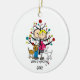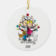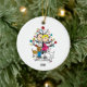 A cute, fun ceramic ornament featuring a stick figure expectant couple, a brown dog and a white dog, holiday tree, and text that reads "We're Expecting!" with an area you can add the current year!