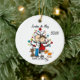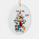 A cute, fun ceramic ornament featuring a stick figure expectant couple, two cats, holiday tree, and text that reads "We're Expecting!" with an area you can add your names or surname and the add the current year!