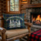 Bring cabin cosiness to your sofa or bed with this custom throw pillow. Featuring a hand-drawn log cabin with pine trees and sunshine over classic green-and-blue tartan plaid, it’s a charming decorative piece for a rustic lodge, mountain getaway, or woodland home. Personalise with your family name for the perfect snuggle-worthy gift or stylish accent.