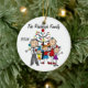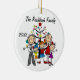 A pretty round ceramic keepsake Christmas holiday ornament features a stick figure dad, mum, two boys in baseball caps and a girl in a purple dress in front of the decorated Christmas tree and areas where you can add text including the current year and family name. This is an adorable gift for any family to commemorate the year!