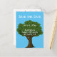 ''Save the Date' is at the top of this blue postcard. A large tree is the background for your personalised text such as your family's last name, reunion date and place.