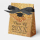 Custom faux gold image class of graduation party favor boxes. Elegant boxes for graduate students celebrating their grad year. Add your own high school name and year. Stylish typography template with tassel hat logo. Customizable background color and bow color. Bulk gift idea for him or her. Glamorous sparkly golden background print with glittery glimmers. 2025 and on.