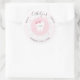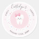 Personalised First Tooth party decorations. Peach pink sticker with cute baby tooth, editable name and milestone date. Visit the shop to see all the First Tooth collection.