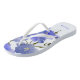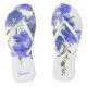 Custom floral flip flops with beautiful blue flowers against a white background. Personalise name.