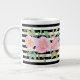 Enjoy your favorite hot beverage in this beautiful mug featuring pink flowers in watercolor and black and white stripes.