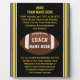 Custom Football Plaques for Coaches are Good Gifts for Your Football Coach. Black and Gold Football Plaque or Your COLORS. You, or CALL Designer Linda: 239-949-9090 can CHANGE the Black Background and Yellow Gold Text to your football team COLORS. Only designer Linda can change the White and Gold Sports Stripes. I can also change this to many other coach sports gifts, as available.