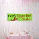 This funny customisable vinyl banner has a cartoon red laying hen holding up a basket of eggs.