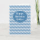 A chic Birthday Card to customise for any name or relative, with blue and white chevrons and a blue panel with white lettering. A digital design by Judy Adamson.
