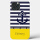 Contemporary ship anchor on a classic blue and white stripes pattern on yellow. Set off with nautical rope, making room to personalise or customise with name, initials or monogram on a coral red background. Beautiful, modern and cool cover for the trend-savvy and art-loving hip trendsetter, artsy motif lover who wants to protect their phone from dust and dirt, wear and tear. This design is available Apple iPhone 6, 7 and 8 Plus, 10 or X, XR, XS , 11, 12, and 13 Mini and 14 Pro Max cellphone cases. Show off your personal style, look fashionable trendy and feel stylish with a unique design on a mobile device accessory of your choice.
