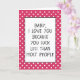 Cute greeting card with a funny quote for the love of your life, husband or wife, boy- or girlfriend, or even your mum or dad, on a pink and white coloured polka dots background. With the option to customise with name, word, or (limited) text of your choice. Let those with a sense of humour know that you love them to the moon and back with this sarcastic and humourous 'I LOVE YOU BECAUSE YOU SUCK LESS THAN MOST OTHER PEOPLE' quote.