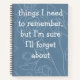 The Funny Quote for Forgetable People Notebook is the perfect reminder for anyone who hates remembering things. With custom sizes, sipral colours, and inside paper designs this Notebook is sure to put a smile on your face every time you open it! You can also add your own quote!