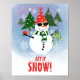 Make a bold seasonal statement with this holiday poster featuring the snowman surrounded by decorated pine trees and falling snowflakes. His red Santa hat, green scarf, and confident pose bring a playful twist to winter decor, while the cool watercolor background adds depth and elegance. The editable text allows you to tailor the message — from “Season’s Greetings” to “Let it Snow!” or a personalised name in modern brush script.