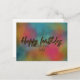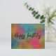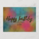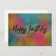 Modern and trendy personalised birthday postcard design featuring the text "Happy birthday" written in faux gold glitter script on a colourful watercolor background.