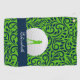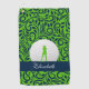 Your favourite golfer will love this design created especially for her in bright green & navy. Female golfer silhouette is placed on a realistic image of a golf ball. A coordinating ribbon completed in navy blue is positioned slightly below the golfer and is the template for custom name or text in white script calligraphy. The background is bright green and features a contemporary pattern of swirls and leaves in coordinating blue. ALL colours in this design may be customised!