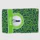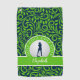 This custom design features a female golfer silhouette set on a realistic golf ball image. The golf ball is placed on a bright green circle that is bordered with curved text "GOLF GOLF GOLF GOLF" in white font. A green band holds a template for a monogrammed name or custom text. The background is a navy blue with a trendy bright contemporary green pattern of modern swirls and leaves. All colours in this design may be customised! If you have any questions regarding this or any of my designs please contact beachpausedesigns@gmail.com. Custom requests accepted.
