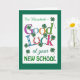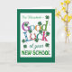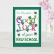 A Good Luck at New School greeting card to personalise, with brightly coloured lettering, four-leaf clovers and a horseshoe for luck! A text-based,