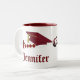 Lovely gift mug for your favourite graduating senior, with stylish graphics of a diploma and red mortarboard cap. Red graphic text reads Class of, and customisable red text reads the year and name of the graduate. Personalise for yourself or your favourite grad.
