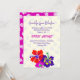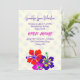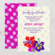 Open house graduation invitation with bold hibiscus flowers design. Perfect for a daughter's graduation from high school. Her name is in purple script at the top with date, school name and class beneath. "Open House" is in bold dark pink with more text beneath for party time and location. Red, purple and pink flowers at the bottom, and background of falling graduation caps, which continues to the reverse over a bright pink background.