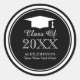 Custom graduation stickers with graduate hat / cap. Stylish black and white round favour stickers with customisable year 2020 2021 2022 etc. Cute icon with monogrammed name initials plus date. Personalised thank you stickers, favour label, envelope sealers / seals. Elegant script typography. Chic design / fancy design. Customisable background colour. ie black. Suitable for high school, college, university etc. Also good for school reunion parties.