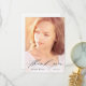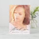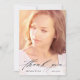 This graduation thank you card features modern calligraphy and a full photo of the new graduate. On the front, a black overlay includes the words "thank you" written in pretty script lettering; the graduate's name and graduation year are written below. The typography design overlays a full vertical photo of the graduate. On the back, you can write a custom message to recipients, or delete the template text to create a blank area to write a handwritten note.