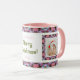 Custom Grandma’s Jolly Pink Merry Christmas Pattern Photo Picture Tea Coffee Mug. In traditional autumnal colors of muted pink, dark red, icy blue, and winter green; in a merry multicolour, maximalist, modern geometric pattern. For winter warmer drinks and cheerful hot chocolate on cozy winter nights in. Change the two photos to your own pictures, and personalize the text, to celebrate joyful family memories. Buy as a budget friendly festive keepsake drinkware, tableware gift for her, mothers, wives, grandmothers, or grandparents.