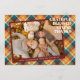 Unique, classy, trendy, pretty and decorative Thanksgiving holiday card. Unique, classy, trendy, pretty and decorative Thanksgiving holiday card. Cute GRATEFUL BLESSED GIVING THANKS text and room to customise or personalise with a photo and names (or family name) of your choice. With cute classic warm yellow fall Mums flowers on a teal blue green, pumpkin orange and dark burgundy wine red coloured rustic farmhouse inspired plaid tartan pattern background design. And a customisable season greeting poem on the backside of the card.