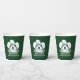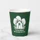 This forest green real estate company seltzer paper cup is perfectly customised for a realtor open house near the wilderness or woodlands. The white silhouette of trees behind a log cabin home and personalised with your agent and realty business name for marketing in the backwoods.